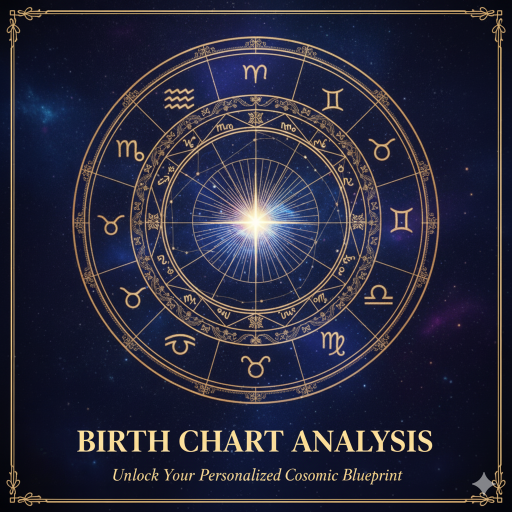 This is your foundational, all-in-one guide to understanding you. We will conduct a deep dive into your unique cosmic blueprint (your natal chart) to uncover your core personality, hidden talents, inherent strengths, and life’s true purpose.